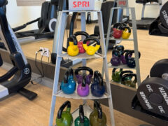 Dumbbells ranged from 5 to 75 lbs/2 to 34 kgs, kettlebells from 5 to 35 lbs/2 to 16 kgs and there’re two adjustable benches to work with.
