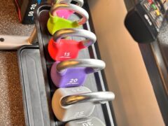 Dumbbells go up to 20 lbs/9 kgs, kettlebells go up to 30 lbs/13 kgs and there’s an adjustable bench.