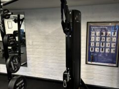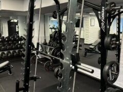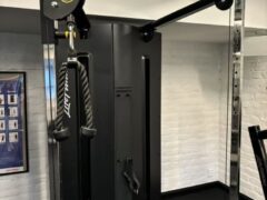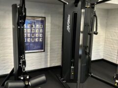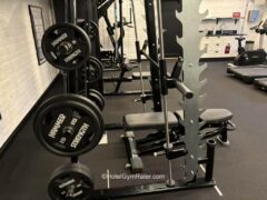 There’s a lat pull down and a leg press machine, a captain’s chair, a dual cable machine and even a Smith machine!