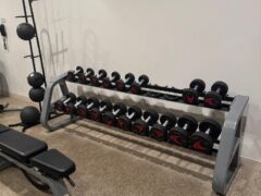 Dumbbells go up to 50 lbs/22 kgs and there’re two adjustable benches.