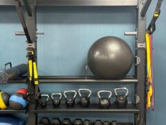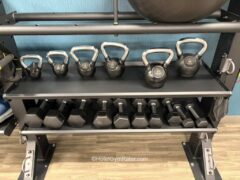 Strength equipment consists of dumbbells up to 75 lbs/34 kgs and there’s an adjustable bench as well. Kettlebells go up to 30 lbs/13 kgs. There’s also a dual cable machine.