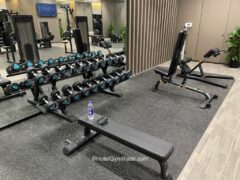 Dumbbells go up to 44 lbs/20 kgs and there’re three benches – two of them adjustable.