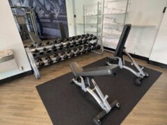 Strength equipment consists of dumbbell sets from 15 to 45 lbs/7 to 20 kgs and there’re three adjustable benches as well.