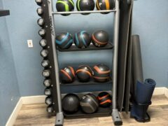 There’s a rack of dumbbells with dumbbells ranging from 5 to 50lbs/2 to 22 kgs, and there’re three adjustable weight benches.