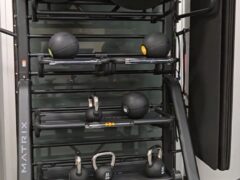 Accessories cover exercise balls, exercise mats, medicine balls and a handful of kettlebells.