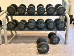Dumbbells go up to 66 lbs/30 kgs and there’re two adjustable benches.